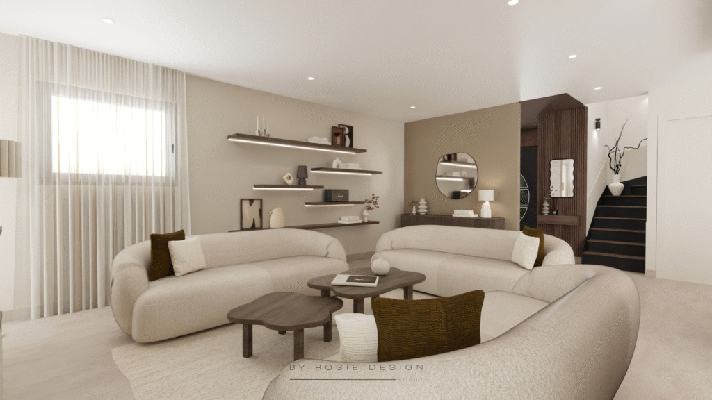 Réalisation octobre 2025Résidentiel – pièce de vie Accompagnement : BOOK PROJECTION 3D Lanrodec – COTES D’ARMOR (22) Un nouvel écrin chaleureux pour cette maison contemporaine. Pour ce projet, mes clients souhaitaient redonner vie à leur intérieur devenu trop froid à leurs goûts. L’objectif : créer une atmosphère chaleureuse, naturelle et élégante, tout en conservant un style moderne et épuré. J’ai donc imaginé un espace harmonieux où les nuances de beige et de brun apportent douceur et confort visuel, le bois foncé structure l’espace et réchauffe l’ensemble. Les formes arrondies et les matières texturées adoucissent les lignes contemporaines.. Un éclairage soigneusement étudié valorise les volumes et crée une ambiance apaisante. Le résultat : une pièce de vie à la fois accueillante, sophistiquée et intemporelle, qui reflète parfaitement la personnalité de ses habitants.